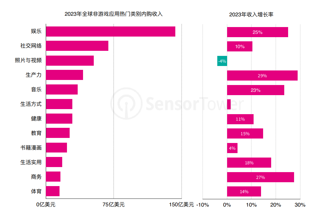 特别是在全球动荡的经济局势中,娱乐、社交、生产力、音乐、健康等十多个不同类别的非游戏应用2023年内购收入仍全面增长。其中娱乐应用收入上涨25%,达到143亿美元。